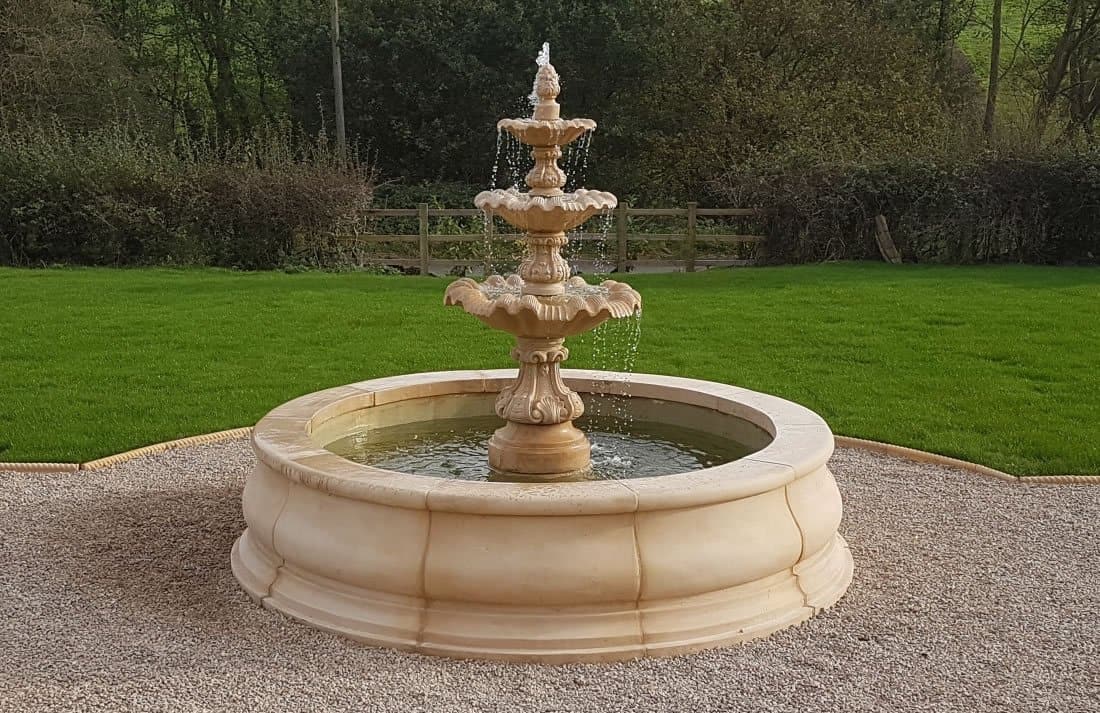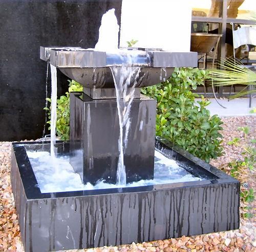 Автономный фонтан разработан с нижней чашей, которая улавливает воду, стекающую с верхних ярусов, и рециркулирует обратно в фонтан с помощью водяного насоса, расположенного в нижней чаше. Это избавляет от необходимости устанавливать фонтан в пруду или большом бассейне, куда падает вода. Вот пример установленного автономного фонтана во время работы.