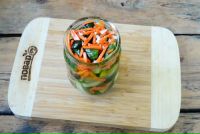 Салат раскладываем в стерильные банки. Красивее салат огурцы по-корейски на зиму с морковью смотрится в маленьких банках. Аккуратно у стенки банки укладываем кусочки огурцов, в центр насыпаем салат как получится, а сверху выкладываем морковь.