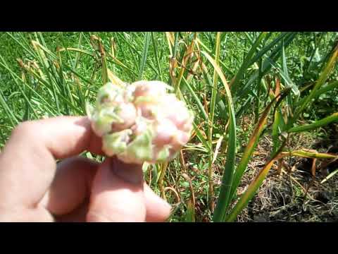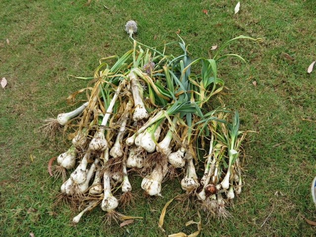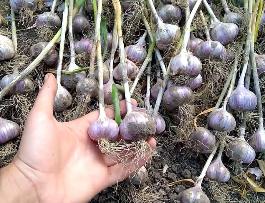 Для определения созревания стрелкующихся сортов культуры на грядке оставляют 2-3 чесночных стрелки. Луковицы готовы к выкопке, когда оболочка шарообразных соцветий начнет растрескиваться. После выкопки растений их оставляют на несколько суток прямо на грядке для просушки под солнечными лучами (вместе со стеблями). Если погодные условия не позволяют, то чеснок переносят под навес и выдерживают в таком виде около 5 дней на воздухе.