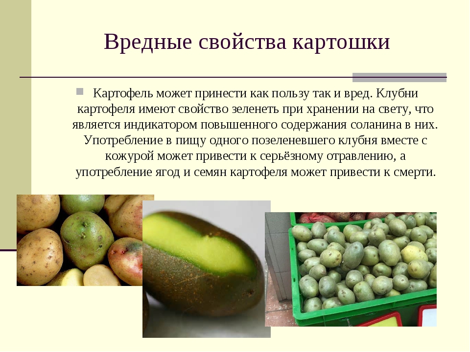 Ответ: Картофель зеленого цвета содержит вещество, известное как Соланин. Это вещество при употреблении в очень больших количествах может вызвать тяжелая болезнь или смерть. Это позеленение картофеля вызвано воздействием свет в период выращивания или чрезмерное воздействие искусственного света в продуктовые магазины или супермаркеты.В саду это чаще всего бывает после обильных дожди, которые обнажают картофель у поверхности, подвергая его воздействию солнечного света.