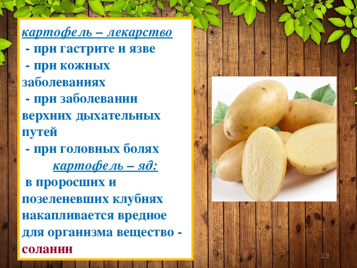 Говорить об опасности в отношении картофеля, хотя бы гипотетической, следует, начиная с середины зимы. К началу нового года клубни теряют большую часть полезных веществ (витаминов), в то же время содержание соланина увеличивается.