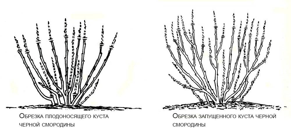 В случае с черной смородиной, удаляются у основания все наиболее слабые побеги и происходит обрезание основной ветви. Как правило, это делается над 2-м или 3-м боковым ответвлением. При этом по аналогии с красной смородиной, должны быть удалены все старые «скелетные» ветки, дающие слабый прирост. Этим действием освобождается место для важного роста обновленных побегов из основания смородинового кустарника.