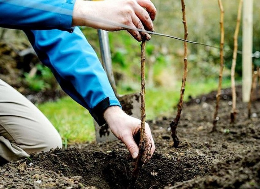 Если сроки посадки были пропущены, то саженцы на зиму нужно прикопать в землю. Для этого на самой высокой точке участка выкапывают канавку высотой 50-60 сантиметров, и укладывают туда саженцы. Чтобы избежать солнечных ожогов, крона должна лежать в южном направлении. Затем корни присыпают землей и тщательно поливают. Как только наступят холода, растение почти полностью закапывают почвой, оставляя на поверхности лишь кончики веток. Для защиты от грызунов сверху укрывают лапником.
