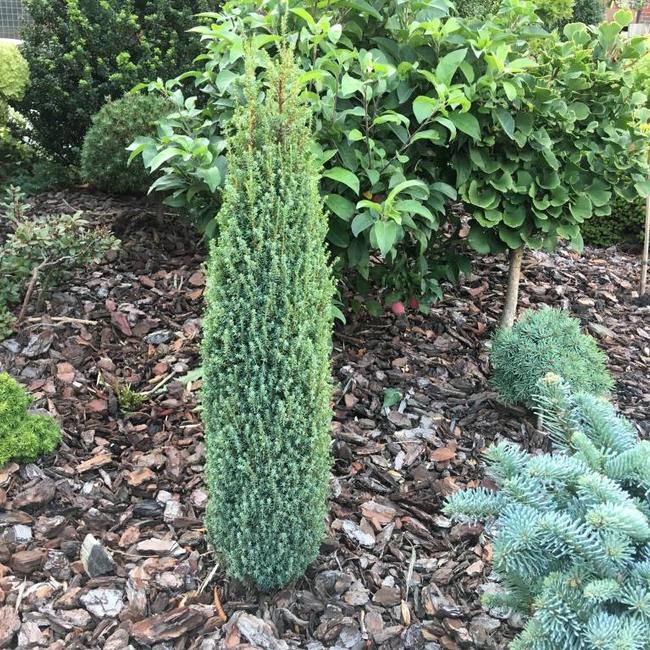 «Канаэрти». Коронка столбчатая, хвоя — темно-зеленая. Можно сажать в живую изгородь, группу, экземпляр.