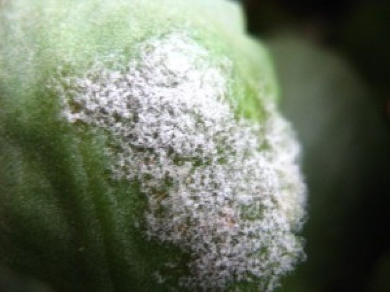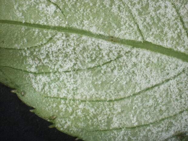 Споры мучнистой росы попадают с больного растения на здоровое и вызывают его заражение. На растении появляются белые слегка пушистые пятна. Появляются они как на внешней, так и на внутренней стороне листа, поражаются и бутоны.