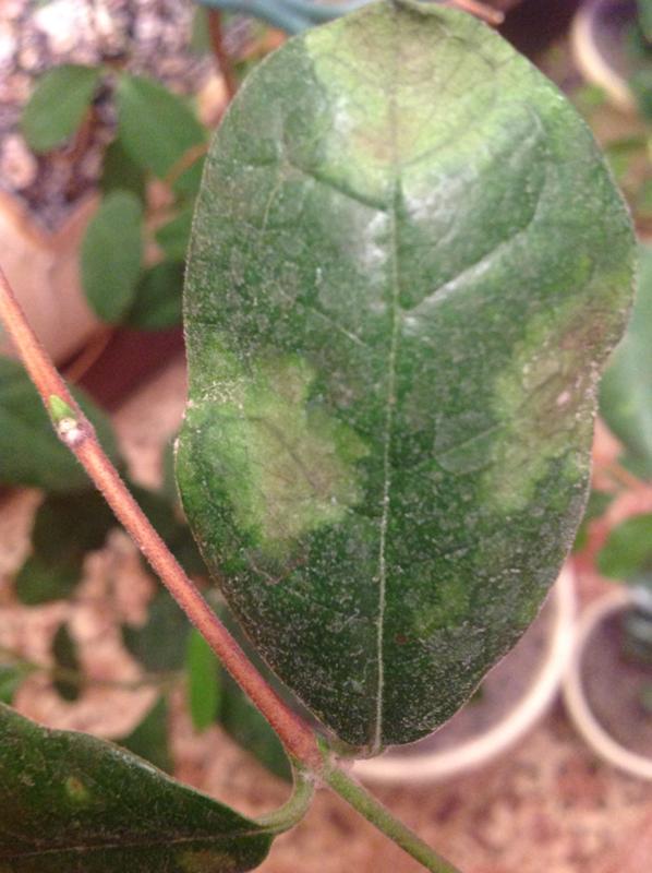 Цветок выглядит угнетенным, снижается количество и качество урожая, ветки закручиваются, и отмирает листва. На ветках и листовых пластинах отчетливо виден белый налет похожий на муку.