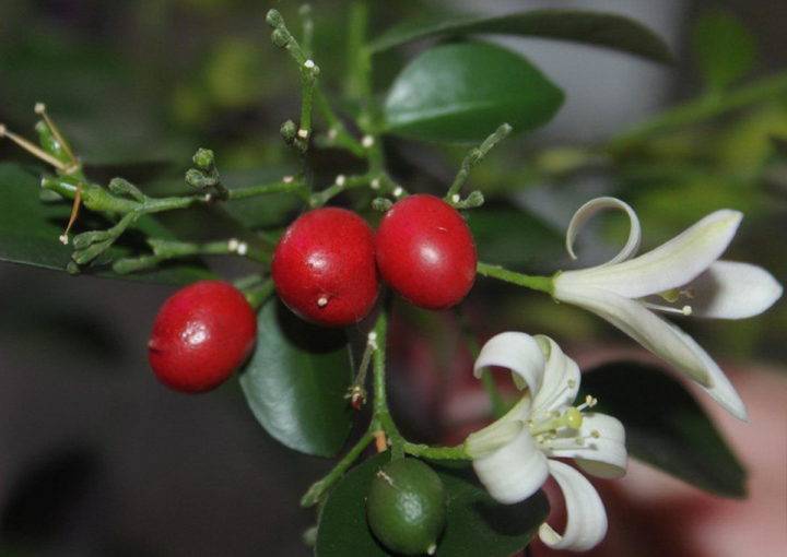 Крошечный красный плод, свисающий с апельсинового жасмина, имитирует внешний вид взрослого фруктового дерева в природе.