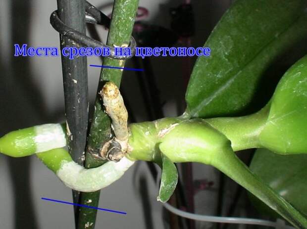 Цветонос укорачивают до верхней ждущей почки, обрезая его на 2 см. выше. Обрезку производят секатором, после чего срез подсушивают и замазывают садовым варом.Основные условия для появления детки: