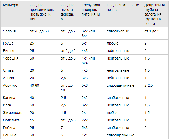 | Вишня | 5 футов. | 4-8 футов. | 2-3 | 1-2 кв. |