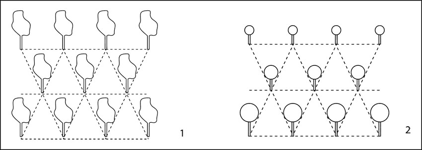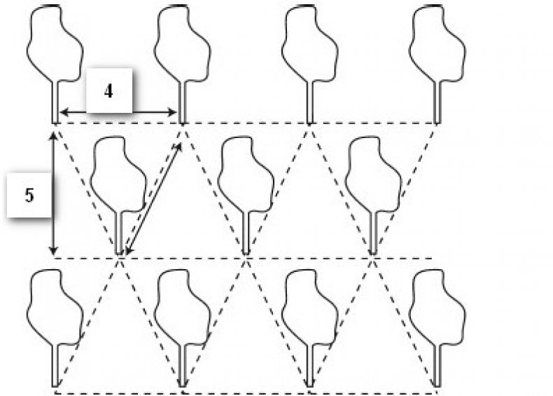 - шахматная, или треугольная, когда растения высаживают в углах равносторонних треугольников;