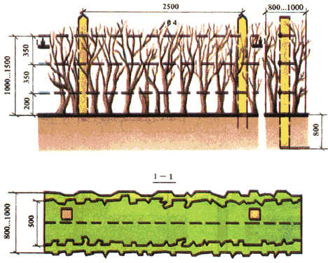 | Колонновидные сорта на карликовых подвоях | 2-2,5 | 0,5-1 | 15-20 | М8, М9 |