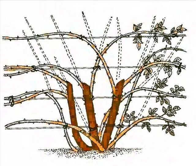 Удалите все мертвые, больные или веточки. У укоренившихся растений ежегодно удаляют самые старые побеги у основания. Остальные трости перемещаются и при необходимости закрепляются. Для планового ухода удалите все отцветшие соцветия и обрежьте до сильного глазка. Трости привязывают по мере взросления. Не пытайтесь сделать это до того, как древесина созреет, так как мягкий нежный нарост легко обламывается.