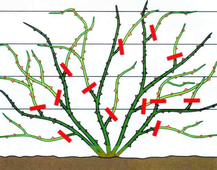 Затем удалите слабые, тонкие побеги, побеги, растущие к центру куста, более слабые из двух перекрещивающихся побегов, побеги, которые растут вверх, а затем вверх, и присоски, если они есть. Наконец, обрежьте все оставшиеся побеги до половины их прежней высоты.
