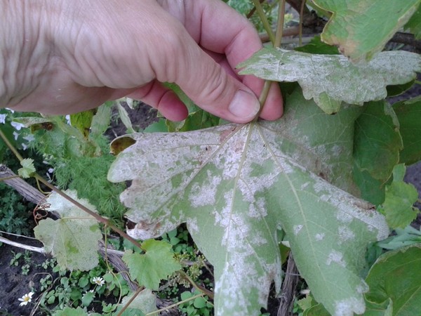 Покрытие зелени винограда бело-серым напылением является признаками оидиума. Налёт может покрывать лист частично, а может весь целиком. Белые припудренные мазки можно заметить уже при отрастании первых побегов, а к июню грибок активируется и покрывает и верхнюю, и нижнюю стороны листьев.