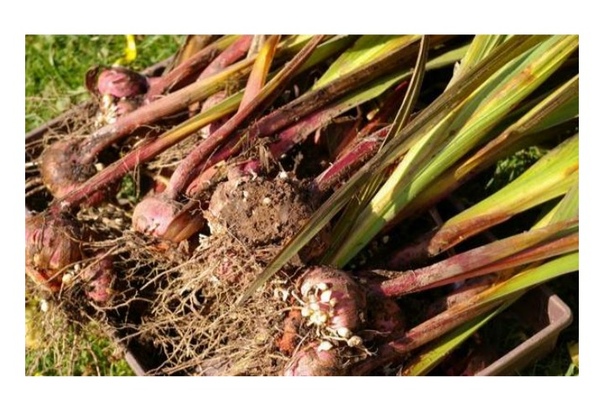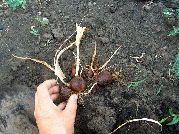 Осенью не спешите выкапывать растения. Дождитесь первых заморозков. Не беспокойтесь, корневища будут в полном порядке. В это же время выкапывают и георгины. Степень готовности растения к выкапыванию определяют так: после заморозков листья должны почернеть, значит – пора. Если вы не выкопали корневища после первых заморозков – ничего страшного. Главное, чтобы еще не было стабильных отрицательных температур ночью.