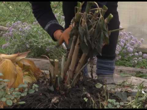 Разрыхлите грязь вокруг основания растений большой садовой вилкой. Как только почва станет рыхлой, копайте глубже лопатой или лопатой, держа инструмент на приличном расстоянии от стебля растений, чтобы не повредить большое мясистое корневище, напоминает Университет Иллинойса в Урбане-Шампейн. Поднимите корневище из почвы вместе с корнями и прикрепленной почвой.