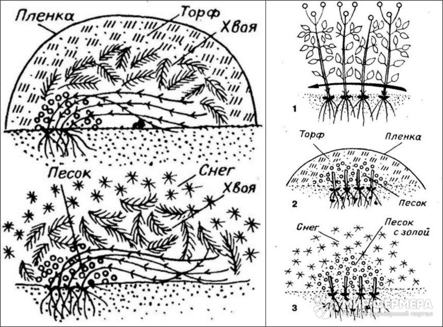 I-II группы (прошлогодние побеги). Эти побеги нужно сохранить, поэтому их аккуратно сворачивают в дугу и пришпиливают к земле. Сверху укрывают еловыми лапами, сухими листьями. Самым верхним слоем укладывают рубероид или пленку. Края плотно прижимают.