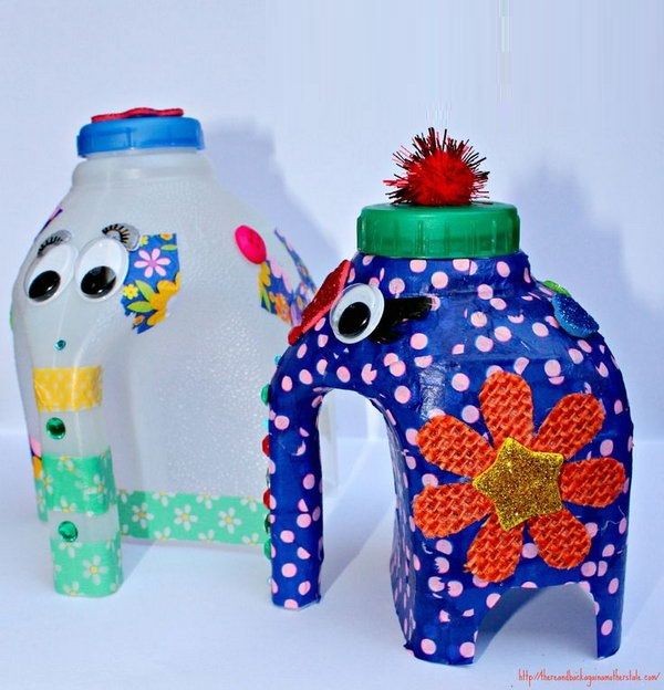 Вот еще одна забавная поделка для детей — красочный слон из переработанной бутылки из-под молока и папиросной бумаги. Попробуйте собрать целое семейство слонов разного цвета, чтобы получить максимальное удовольствие! Из моего детского творчества.