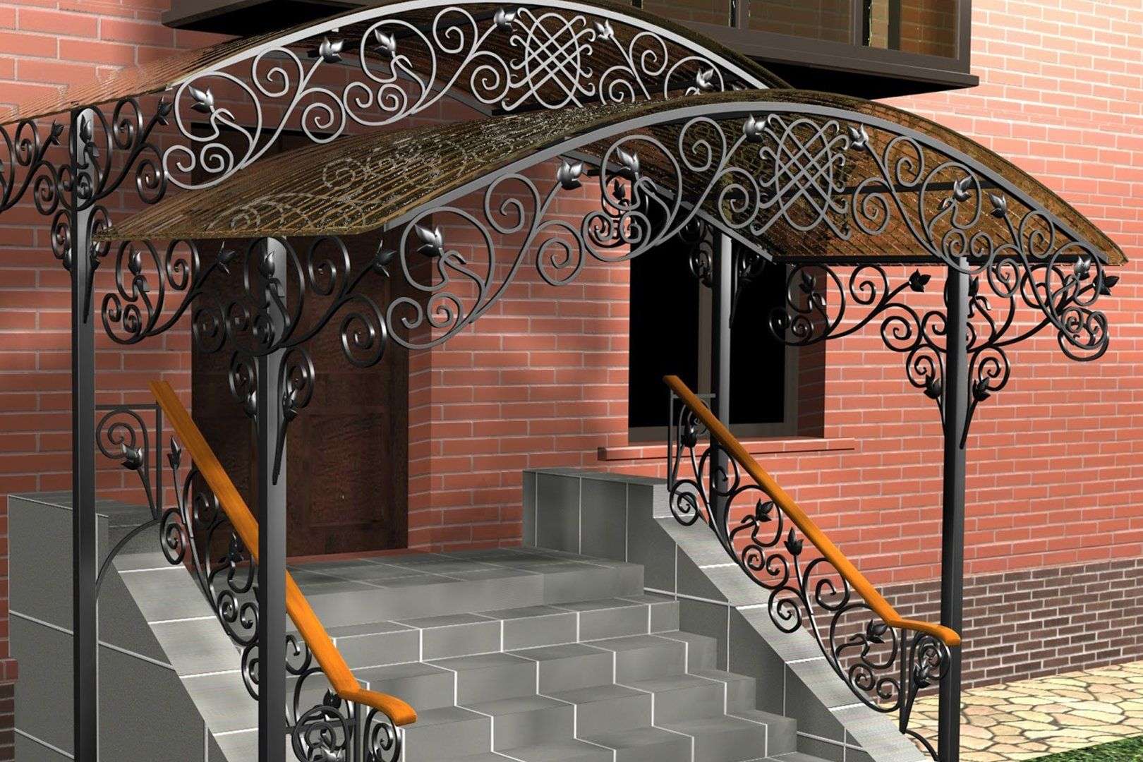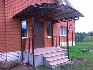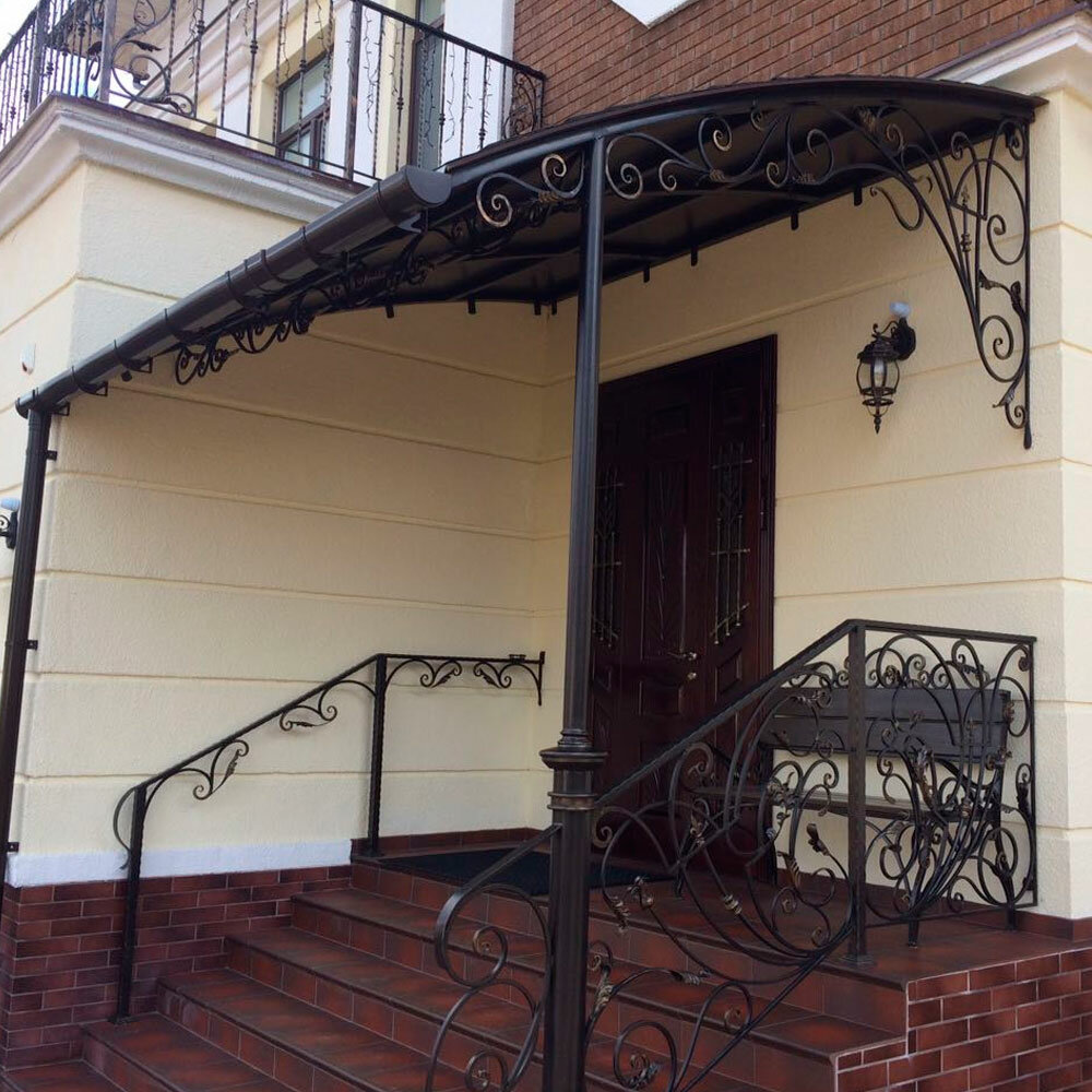 Поскольку козырек является довольно значимой составной частью всего фасада здания, то он должен представлять собой единый архитектурный ансамбль с самим крыльцом, перилами и ступенями.