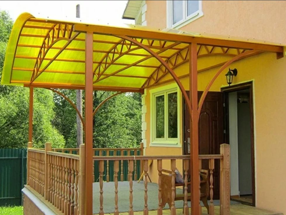 дизайн навеса над крыльцом и входом частного дома, навесные конструкции над входной дверью