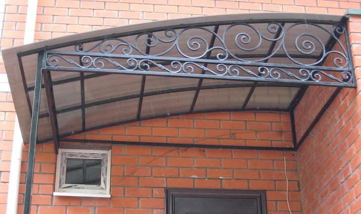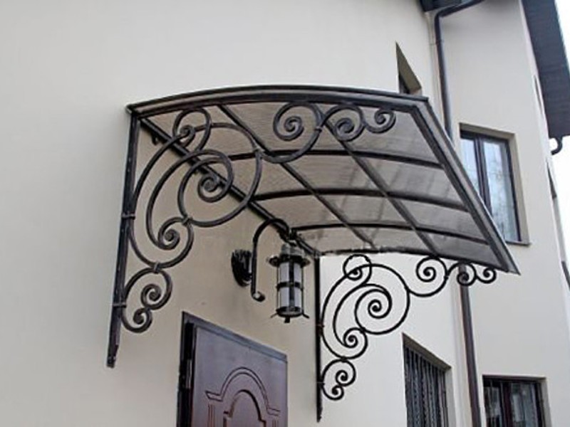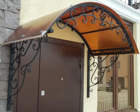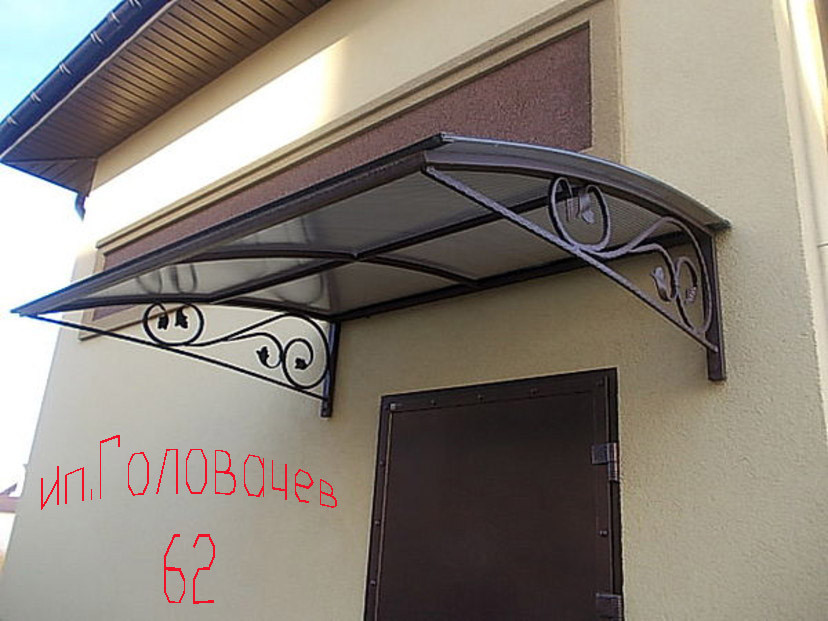 | 2. | Методом крепления опор к стене | Такие козырьки дополняются декоративной металлической ковкой. Небольшая навесная конструкция создаст дополнительный уют фасаду. |