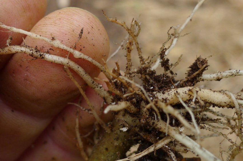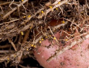 Под лупой на корнях могут быть видны крохотные жёлтые «песчинки» – цисты. Но даже если никаких цист не заметно, беспричинно увядший куст следует аккуратно, вместе с клубнями и комом почвы (примерно 1 кг) отнести в лабораторию. Там специалисты определят наличие и концентрацию картофельной нематоды.