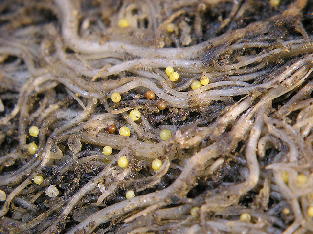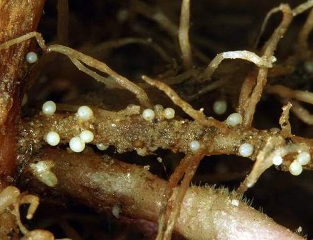 Золотистая нематода — самая распространенная в РоссииКорневая система пораженного кустаОсенью самки погибают, превращаясь в капсулы-цисты, каждая из которых содержит до 800 яиц.