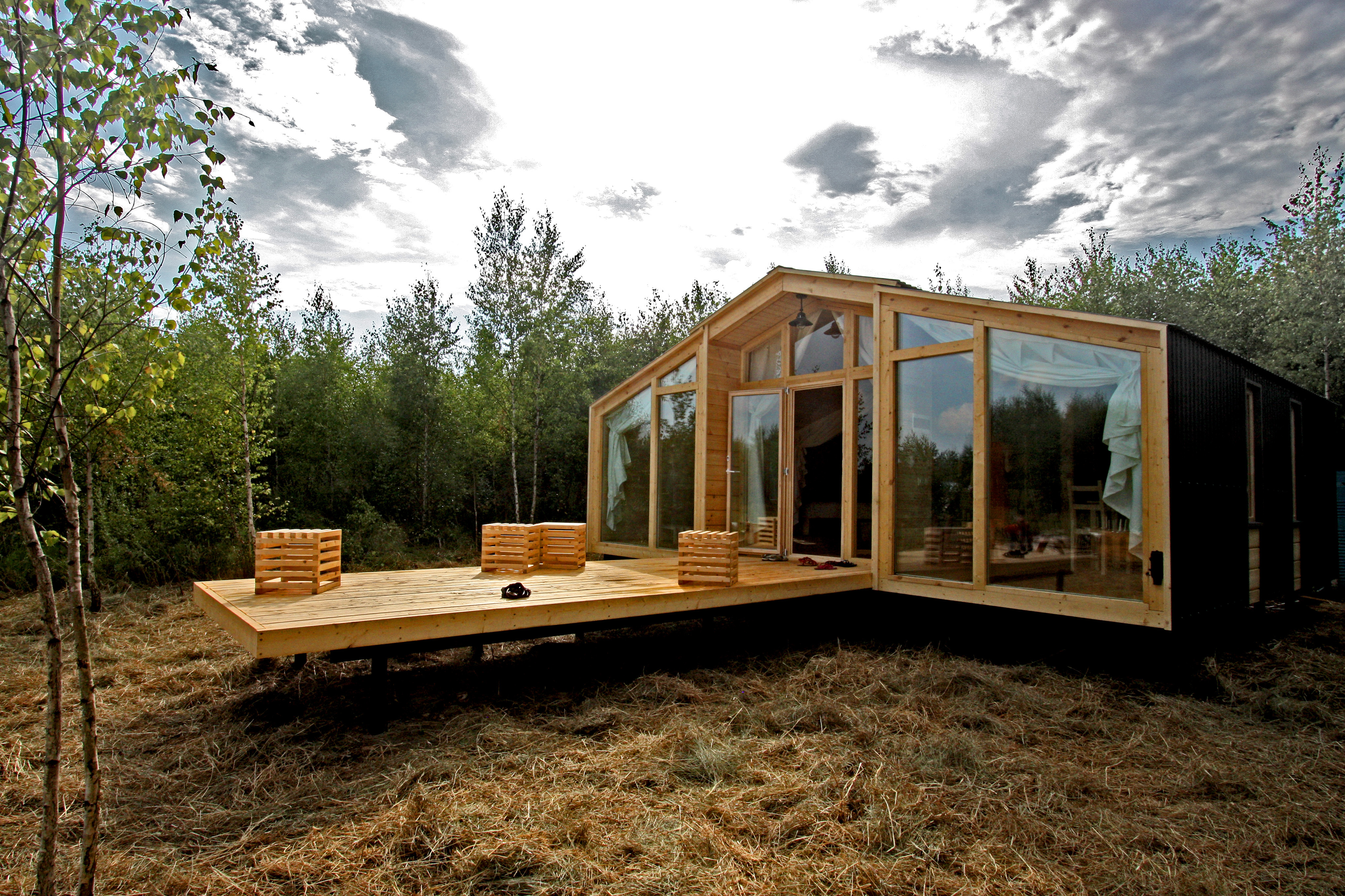 Этот интересный метод строительства появился не так давно в Северной Америке, а сегодня есть предприниматели и в России, которые взяли на заметку идея.Выглядит это все так: утром на участок приезжает грузовик с контейнером, груз снимается с прицепа и ставится на фундамент (бетонную плиту или сваи, например). Всего четыре человека голыми руками переворачивают дом и подключают устройства к коммуникациям. Это был первый день.