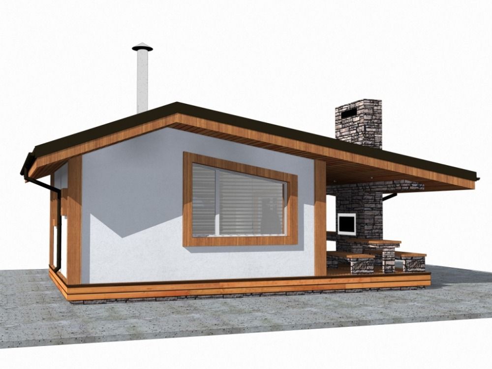 На фото ниже готовый проект бани. По сути в одной конструкции объединены баня и беседка с садовым камином. Здесь можно не только попариться, но и приятно провести летний вечер на открытом воздухе.