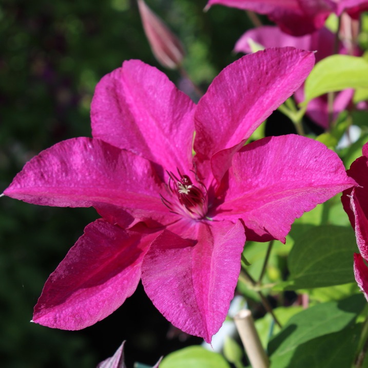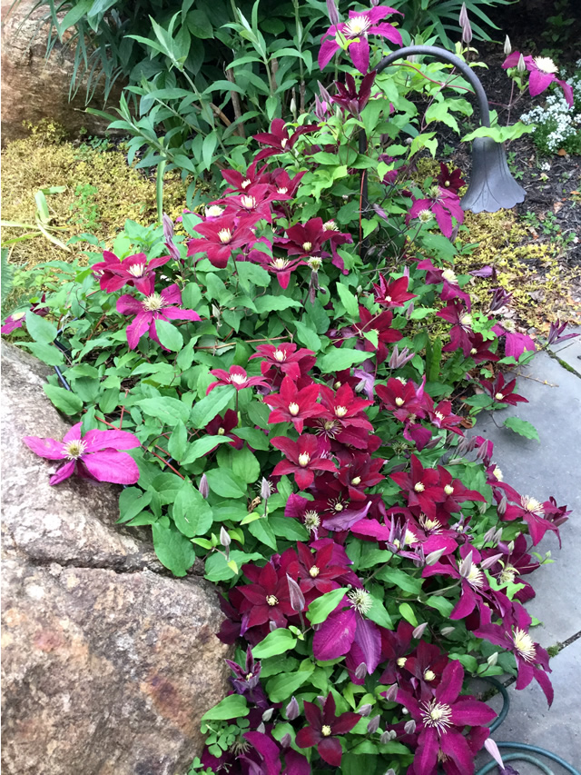 Насыщенный оттенок лепестков клематиса Ниобе не выцветает на солнце
