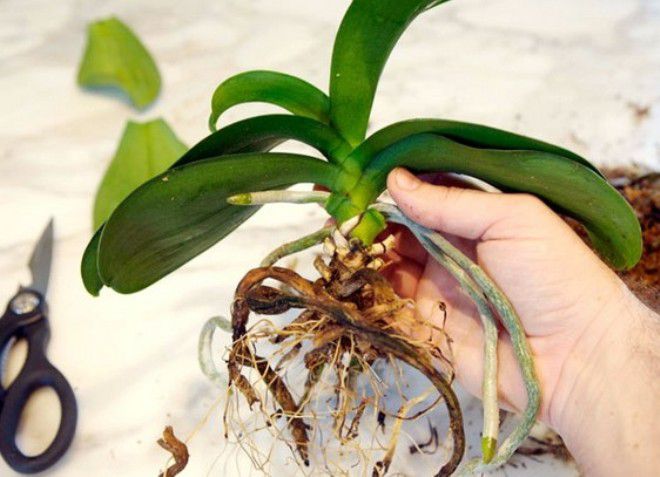 - Аккуратно извлеките орхидею из текущего контейнера и удалите все поврежденные или отмершие корни. При необходимости подрежьте все более длинные корни, чтобы растение сидело примерно на той же высоте, что и до пересадки, а все корни плотно прилегали к новому горшку.