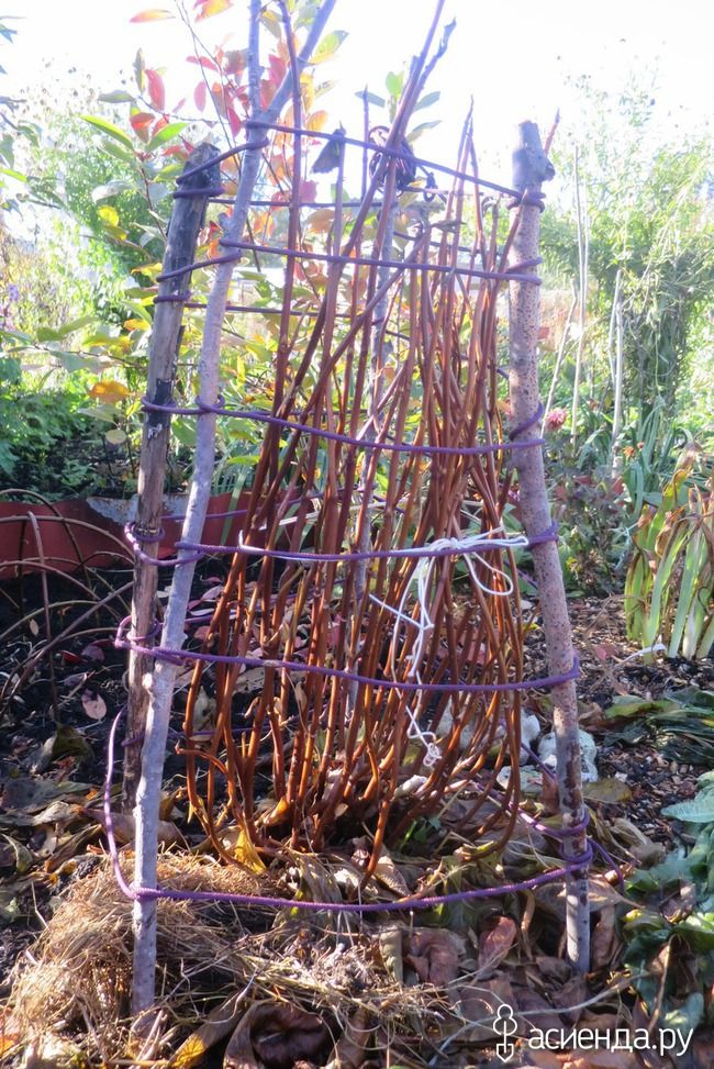 - Оградить молодой цветок с помощью досок, сетки. Пространство внутри ограждения заполнить листьями или опилками, добавить немного земли, а сверху все укутать полиэтиленом и хорошо его закрепить.