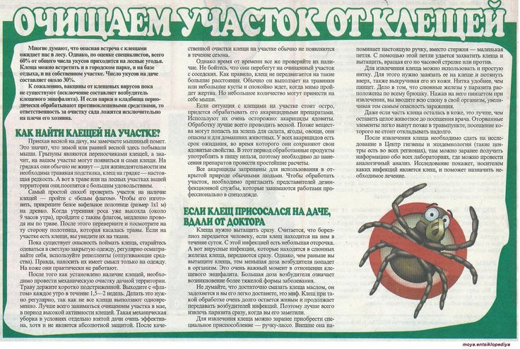 Помните, что поддержание чистоты позволит не допустить появления клещей. Во время обработки не допускайте попадания клещей на одежду. Для этого следует одевать одежду светлых тонов, так как на ней легко заметить клеща. Одежда должна полностьюзакрывать тело. Обработайте одежду различными запахами, которые смогут отпугнуть клещей.Обработка территории от клещей является сложным мероприятием, эффективность которого зависит от степени Вашей активности. При этом, следует помнить, что нельзя превышать дозировки препаратов, которые указаны в инструкции к ним.Это может привести к серьезным негативным последствиям.