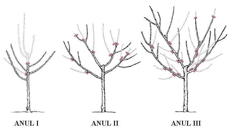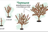 Схема весенней обрезки заключается в укорачивании скелетных ветвей, то есть, нацелена на формирование дерева. Крону черешни обычно формируют в два яруса. Для этого, на первом ярусе оставляют от 7 до 9 скелетных ветвей. Второй ярус будет состоять из 2-3 отводов.