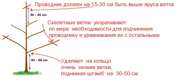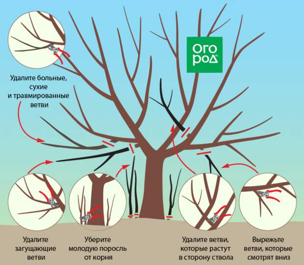 Также не лишним будет удалить волчки (мощные жирующие побеги), молодую поросль на стволе, нижние ветки на развилках и перекрещивающиеся побеги. Наглядно эти случаи представлены на схеме.
