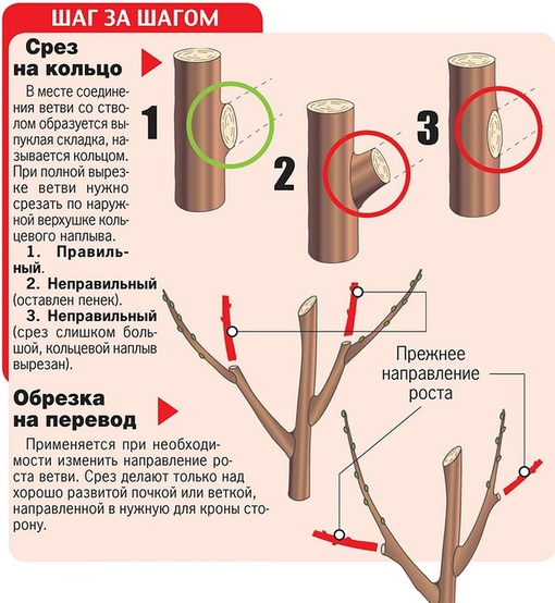 Прежде чем приступить к обрезке, нужно научиться делать правильный срез. На схемах показаны срезы на почку (при обрезке части побега) и на кольцо (когда надо полностью вырезать ветку). Ниже вы увидите, как делать правильную обрезку на кольцо.