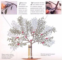 Как вы уже наверно догадались, суть этого метода заключается не в удалении, а в отгибании веток. Делается это так: к стволу саженцу привязывают колышек, это обеспечивает ему идеально прямую форму. К этому же колышку, привязывают все неправильно растущие отводы. Через год, или два, колышек можно убирать, ветки будут расти правильно уже без вашей помощи.
