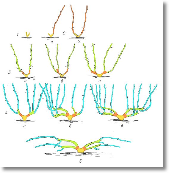 Рис. 110. Понижение штамба куста: 1—общий вид куста с оставлением жирового побега, 2— обрезка куста, 3— тот же куст после подвязки, 4—общий вид куста после развития побегов и подрезки, 5—тот же куст после окончательной подрезки и подвязки.