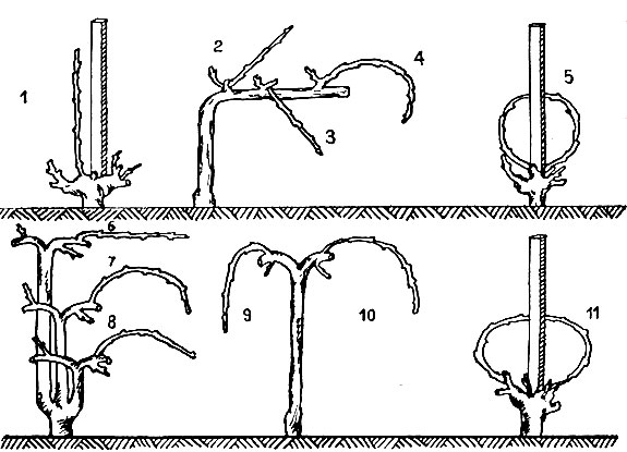 При создании определенных форм и применении обрезки на кустах воспитывается меньшее количество лоз, по сравнению с диким виноградом, но зато почти все побеги являются плодоносящими и обеспечивают нормальную закладку плодовых почек для получения урожая в следующем году.Только при ежегодном воспитании достаточно сильных лоз обеспечивается нормальное плодоношение. На побегах слабо развитых плодоношение в текущем году может быть даже обильным, но в следующем году на таких слаборазвитых побегах получить нормальный урожай нельзя, так как в почках не формируются зачаточные плодовые органы.