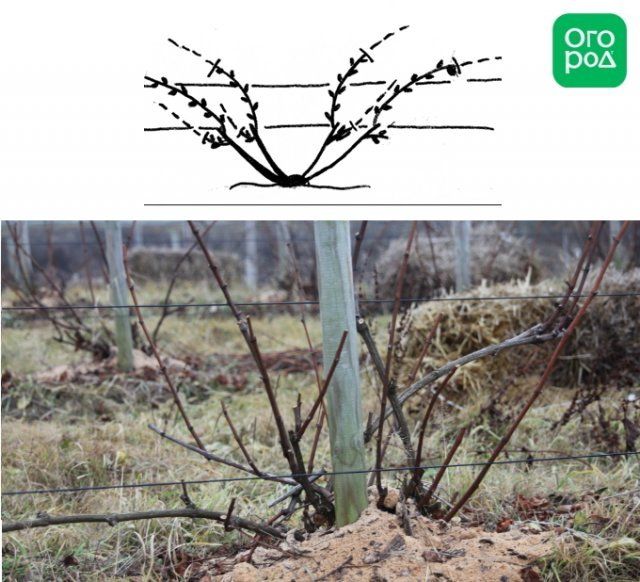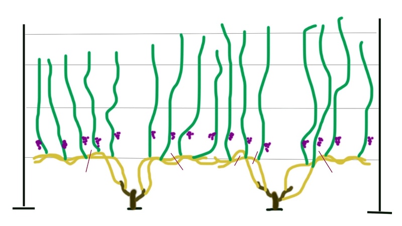 Вот виноградная лоза, которая была уменьшена до двух отростков, которые изогнуты, а затем подвязаны методом обрезки банок.