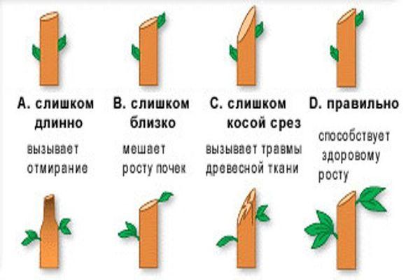 Этот способ удаления побегов используют, если нужно направить рост ветки в другую сторону. Для этого на ней выбирают почку, развивающуюся в нужном направлении. Ветвь удаляют сразу над ней, делая срез под углом 45°. Над почкой оставляют пенек высотой не больше 2 см. Если он будет слишком длительным, растительная ткань высыхает. С наступлением весны такой побег не пробуждается.