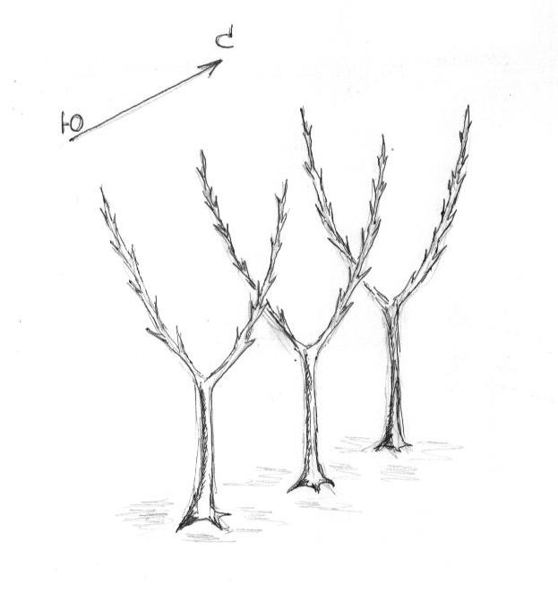 - после 2 года роста центральный ствол обрезают на высоте в 0,25 м от места роста почки, которая расположена выше прошлогоднего отростка;