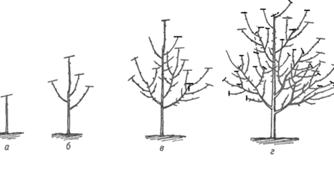 - на 4-ый год к осени у дерева будет порядка 6-8 веток, из которых оставляют только самые крепкие, не больше 3-4, и обрезают их на равной высоте, центральный ствол срезают выше на 0,2 м, чем это было сделано осенью предыдущего года.