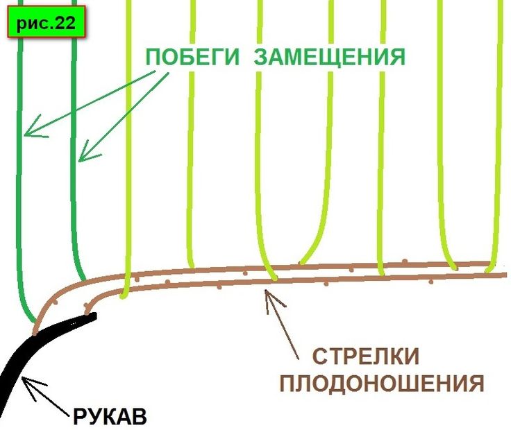 В дальнейшем обрезка будет заключаться в оставлении плодоносящих побегов с 10—14 глазками и 2—3 сучков замещения.