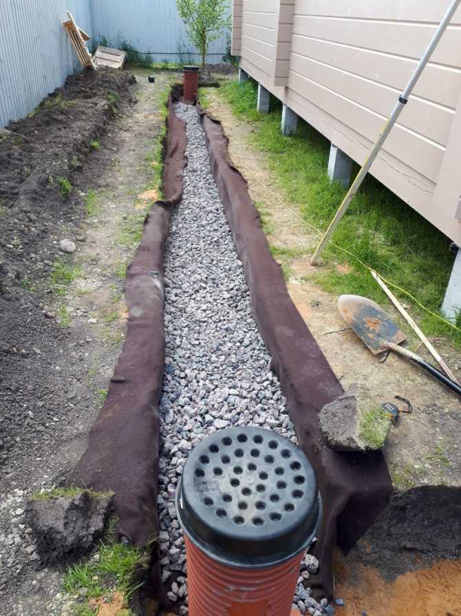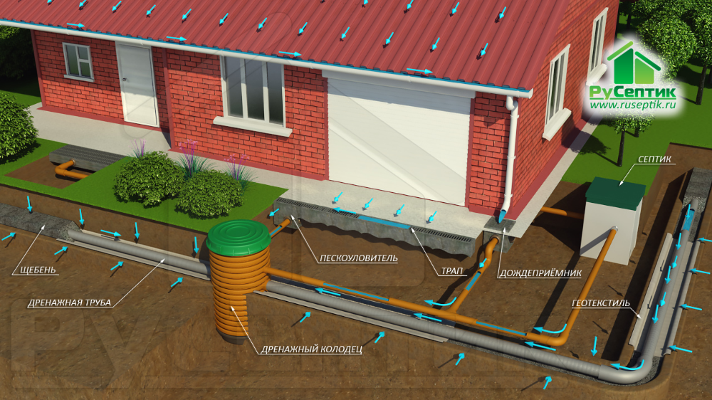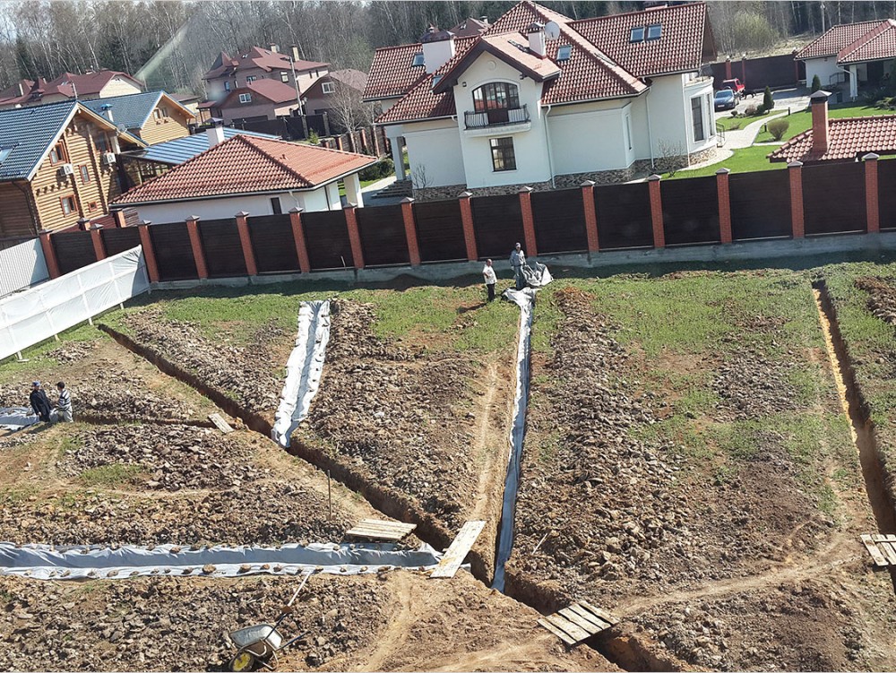 Кроме того, правильно спроектированная и смонтированная система дренажа собирает как поверхностную воду, так и удерживает общий уровень грунтовых вод на необходимой глубине.