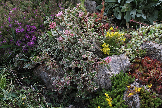 Он украсит и альпийскую горку, и склон холма, и плоский участок. Камни только подчеркнут красоту необычного растения. Разводят очитки в большинстве случаев не из-за цветков. Декоративный эффект создается разнообразно окрашенной листвой, которая может быть разных оттенков зеленого, золотистого, серебристого, голубоватого, темно-красного. Обычно, используются не один, а несколько видов, различающихся по фактуре и цвету листьев.
