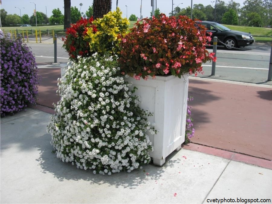 Наиболее удачно будут смотреться в вазонах растения, цветущие весь сезон без перерыва: плющелистная герань, петуния (ампельная, многоцветковая, махровая, каскадная, крупноцветковая), биденс, бегония (клубневая, ампельная, вечноцветущая), вербена, лобелия, алиссум, гелиотроп.