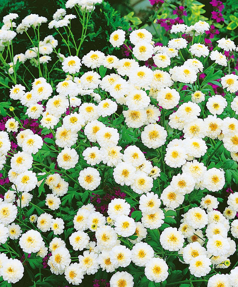 Среди самых эффективных белых сортов — «Linda», декоративный белый цвет слоновой кости, и «Illusion», плодовитая и эффектная ромашка, чьи длинные трубчатые внешние цветки исходят от центрального диска, придавая этому сорту изящный вид.