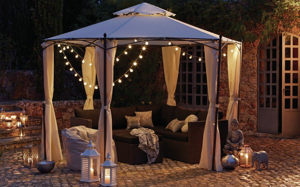 Сказочные гирлянды можно повесить вдоль каркаса беседки, а затем, если их достаточно, обвести по кругу.