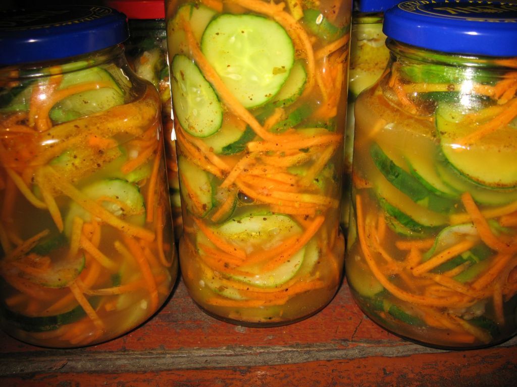 Купить продуктыОгурцы маринованные по-корейски — пряная пикантная закуска, которую можно заготовить на зиму и которая украсит любой праздничный стол. Стоит открыть баночку с огурцами, как тут же разольется по воздуху аромат приправ. Мариновать огурцы с морковкой несложно. Рецепт маринованных огурцов с корейской морковью включает в себя соевый соус и кунжут, которые придают соленью необычный вкус. Выбирайте для заготовок огурцы с тонкой кожицей.